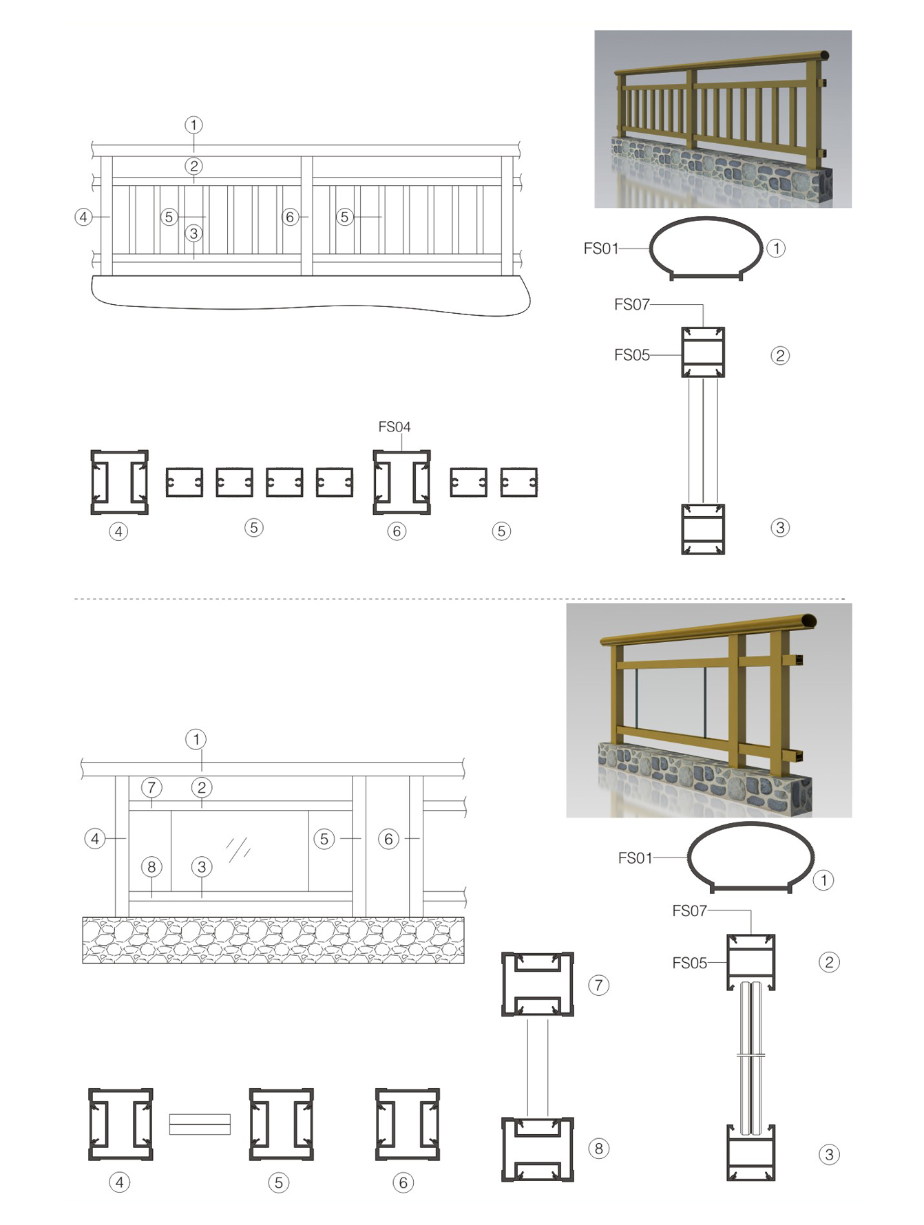 | Model | FS01C | | Nombre | tubo facial | | Grosor de la pared | 2,5 mm | | Peso del metro | 1,271 kg/m | | | | Model | FS04B | | Nombre | Column | | Grosor de la pared | 2,5 mm | | Peso del metro | 1.500 kg/m | | |